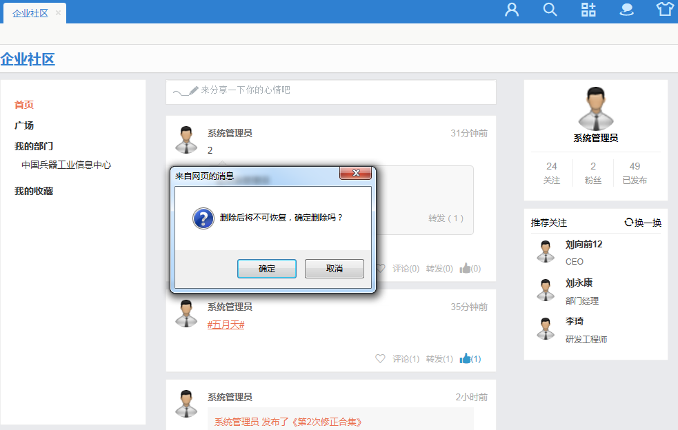 点击【删除】按钮后,可对自己发布的动态进行删除操作。