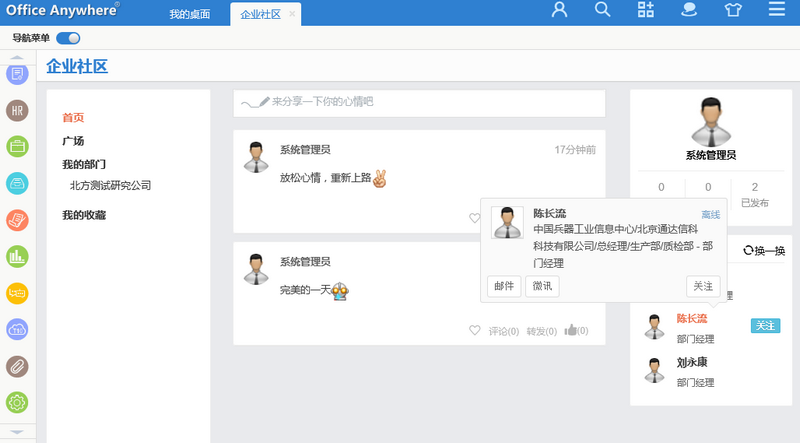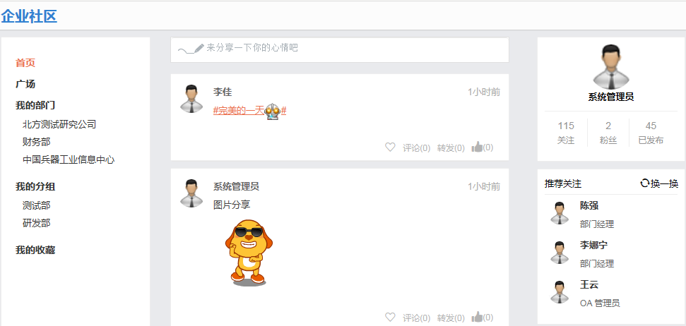 主要分为:首页、广场、我的部门、我的分组、我的收藏五部分显示,将人员动态信息分类,起到导航的作用。