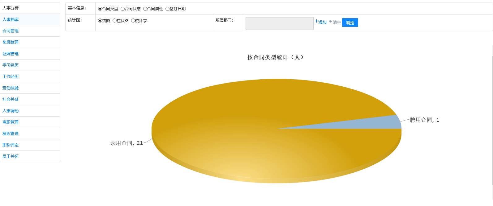 人事分析,可以对人事管理下各个模块,进行统计分析,以辅助人力资源管理员及单位领导进行人事决策与人事调整。该模块中可以各个模块中的基本信息进行统计和分析,还可以选择部门,只对某一个部门进行基本信息的统计和分析,人事分析界面如下,下图显示的是人事档案中学历的饼状图。