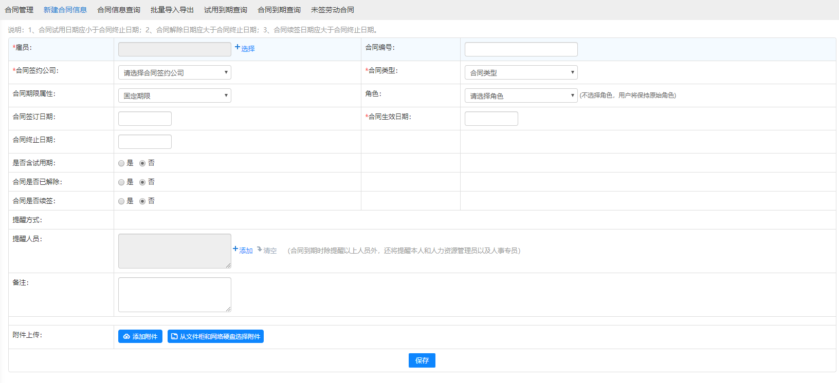 提醒人员,分为三种,一种是本人,另一种是设定提醒人员、对部门有管理权限的人力资源管理员,给用户本人发的信息是只能查看,不能修改,给本人以外的人员发的信息是可以对合同进行编辑调整。