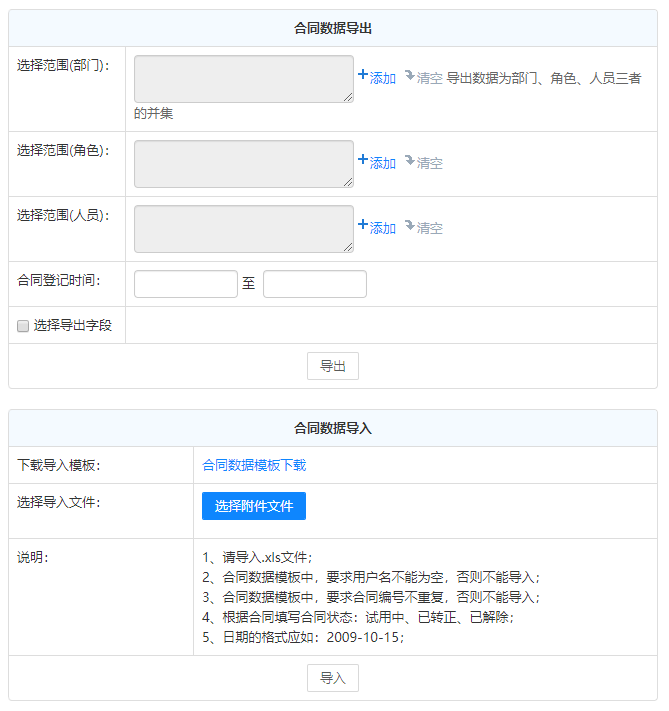 在“合同数据导入”中合同数据模版中,要求用户名、姓名必须填写一项,否则不能导入;合同数据模版中,要求合同编号不重复,否则不能导入。