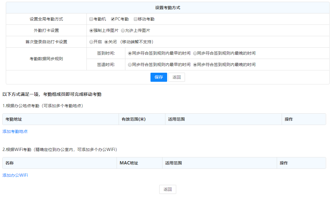 考勤方式可以选择三种考勤方式:手动考勤、自动考勤和考勤机考勤。可以设置两种考勤方式,第一种是根据办公地点考勤(可以添加多个考勤地点),第二种是根据WiFi考勤(可以精确定位到办公室内,添加多个办公WiFi)。该设置是针对移动端考勤打卡进行的设置,只要在考勤时间范围内,满足上述两者中的一个,就可以在移动端打卡成功;