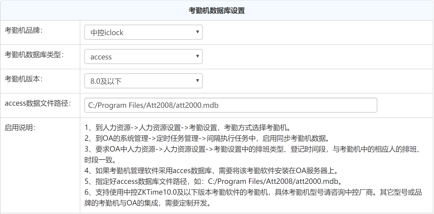 是对公司应用的考勤机品牌、考勤机采用的数据库、数据库文件路径等进行设置,以便考勤机与OA系统相连接,实现OA考勤系统对考勤机的数据进行共享和数据管理。