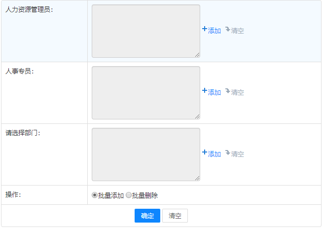 批量设置人力资源管理员中,可以同时为一个或多个部门设置人力资源管理员和人事专员,更加方便人力资源经理进行批量管理。