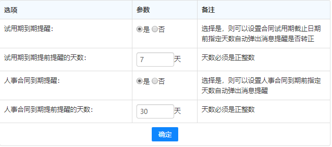 人事合同提醒设置,设置“试用到期”和“人事合同”提前提醒的天数,默认的值为试用期7天,人事合同为30天。