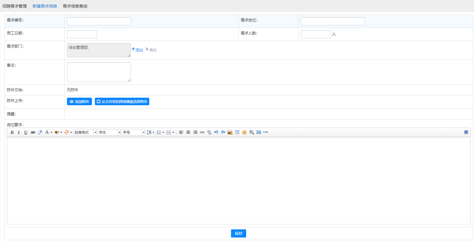 点击【新建需求信息】进入该界面后,填写需求内容即可创建新的需求计划,各部门的需求计划将汇总到人力资源部,由人力资源部统一处理。