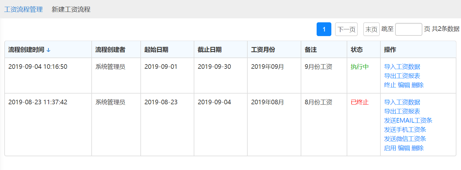 注意:对于执行中的工资流程,可以导入、导出工资数据,终止,编辑,删除操作。对于已终止的流程,不能再进行财务工资录入和部门工资上报,可以启用恢复执行再进行录入操作。已终止的流程,可以发邮件、手机短信工资条。