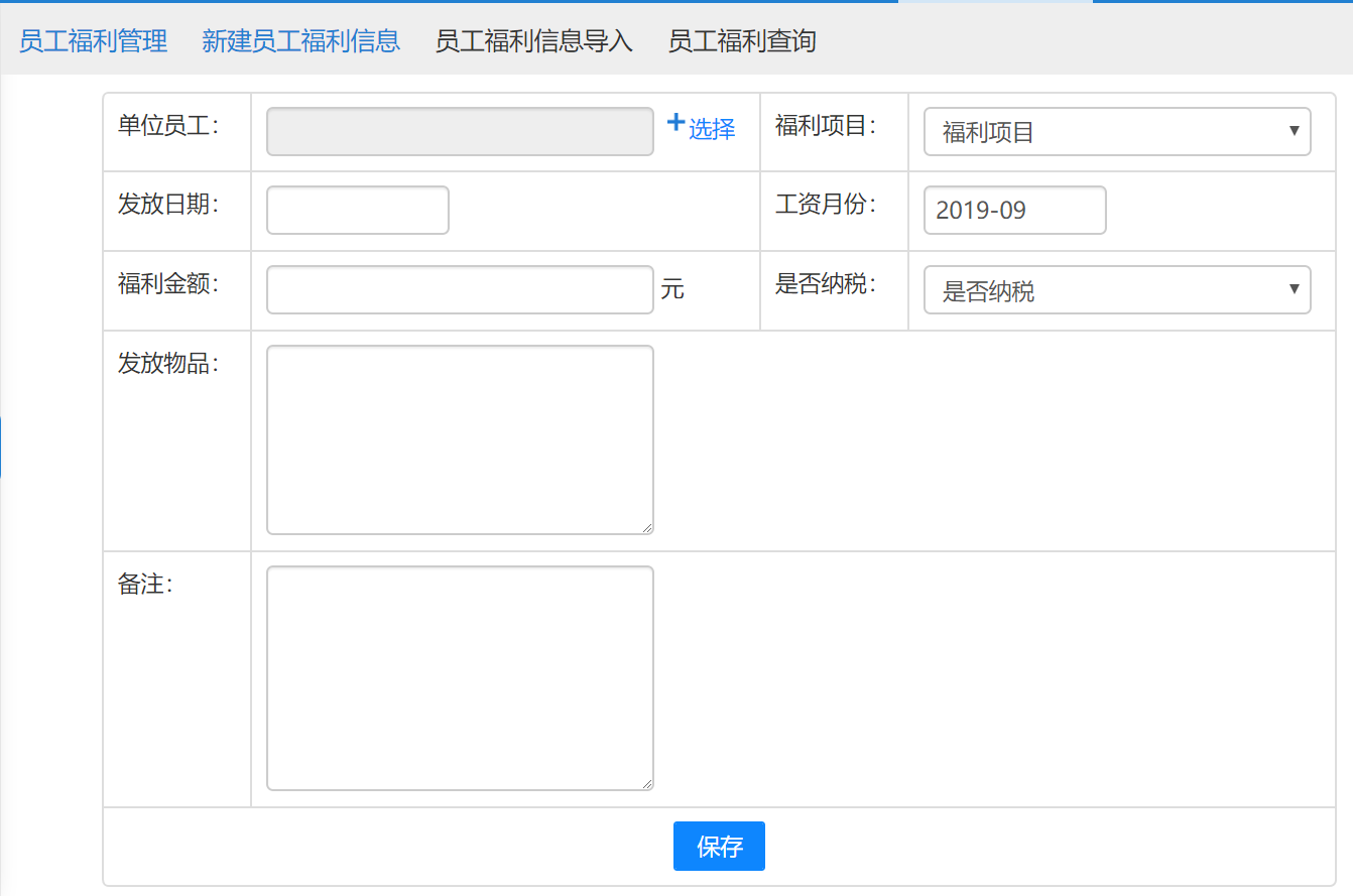 新建员工福利界面中,用户可选择分发福利的员工、福利项目,还可以填写福利金额和发放物品等内容新建一条员工福利的记录。