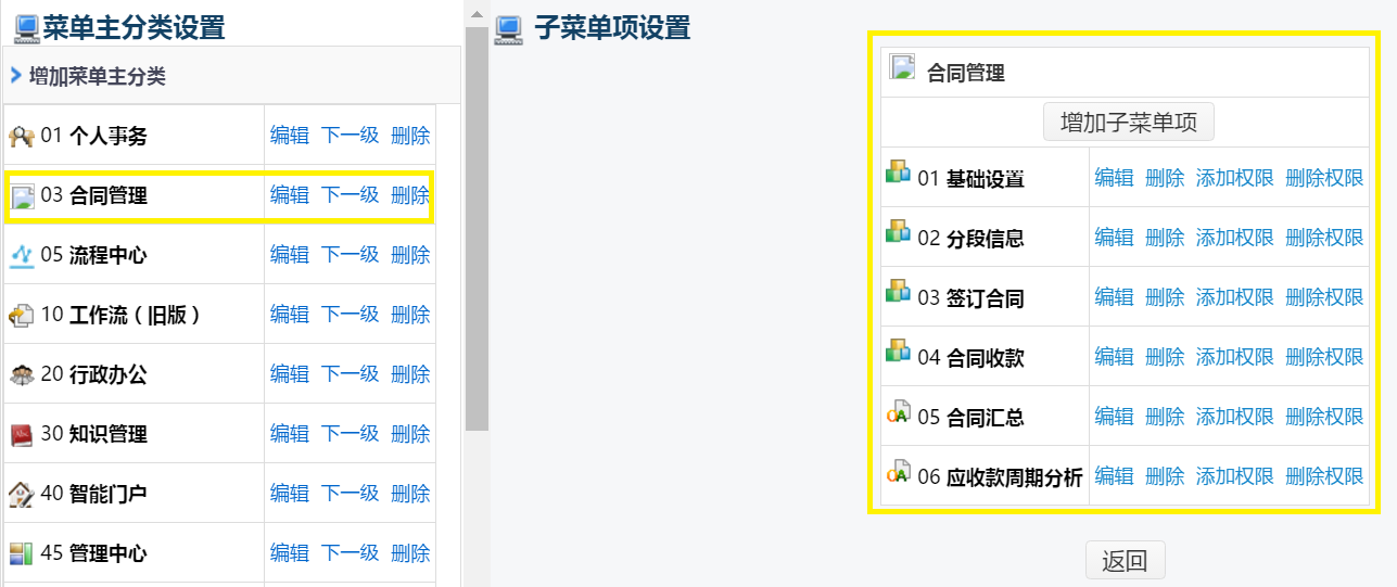 通过应用中心设计的应用系统可以通过菜单来发布和使用,也可以通过 应用中心 -> 我的应用 里访问。点击OA系统的 系统管理 -> 菜单设置 ,设置合同管理所需要用到的菜单,如下图: