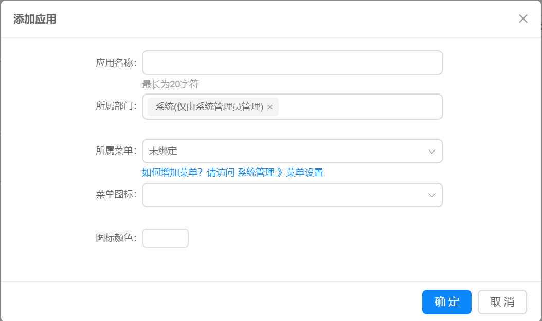 所属菜单: 指应用所绑定的菜单。通过应用中心创建的应用,如果是通过独立菜单来访问的,那么应用需要绑定一个菜单。所属菜单可以空着,等后期系统建成以后通过自动绑定菜单由系统自动赋值。