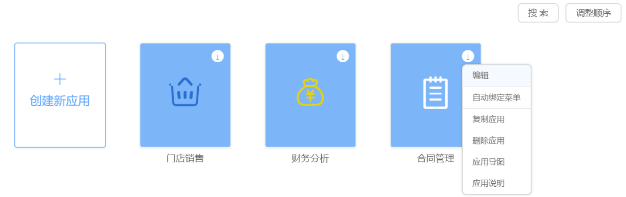 创建新应用后,还可以对应用进行自动绑定菜单、创建应用导图、添加应用说明、编辑、复制、删除以及调整应用之间的顺序,如下图:
