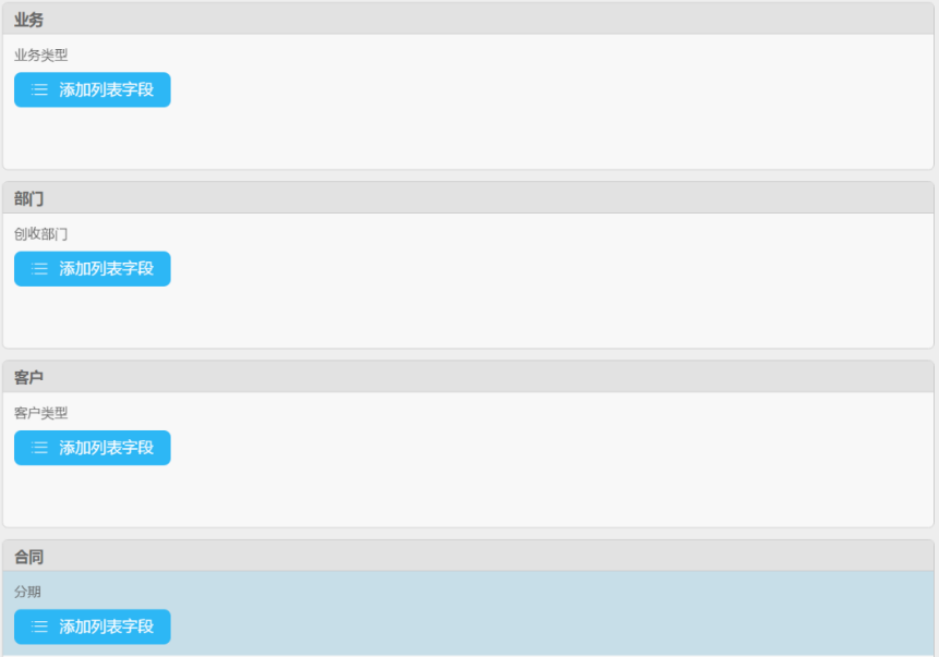 根据2.2.1节需求描述,基础设置表单需要体现四组信息,分别是业务类型、创收部门、客户类型以及合同分期,因此我们拖拽四个单列布局容器到表单区域中,并把它们依次命名为”业务”、”部门”、”客户”、”合同”,如下图: