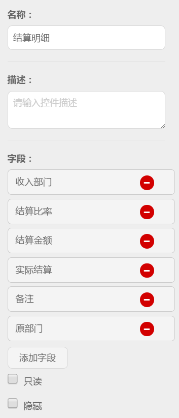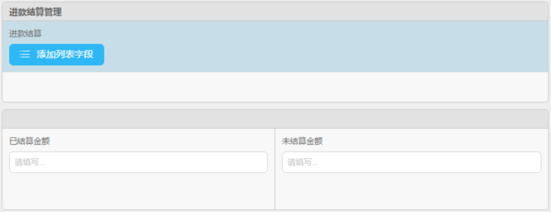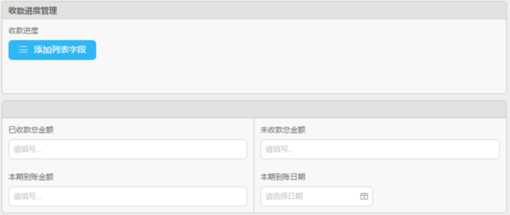 收款进度管理部分使用一个单列组容器和双列组容器,单列组容器命名为”收款进度管理”,双列组容器取消勾选”显示组容器名称”选项。单列组容器定义一个列表控件,控件名称为”收款进度”,并添加以下子字段: