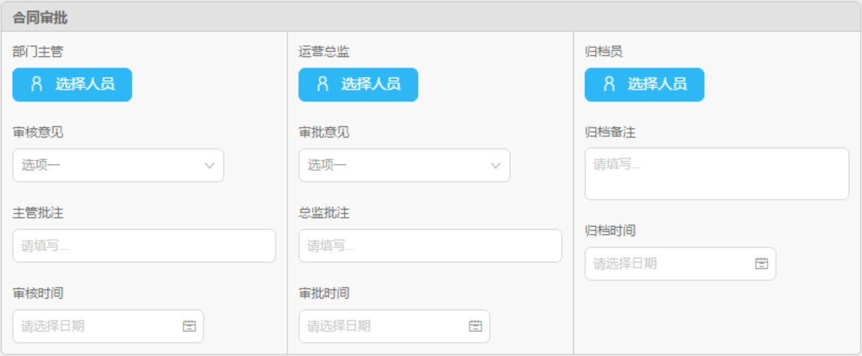 签订合同 -> 主管审核 -> 总监审批 -> 归档。