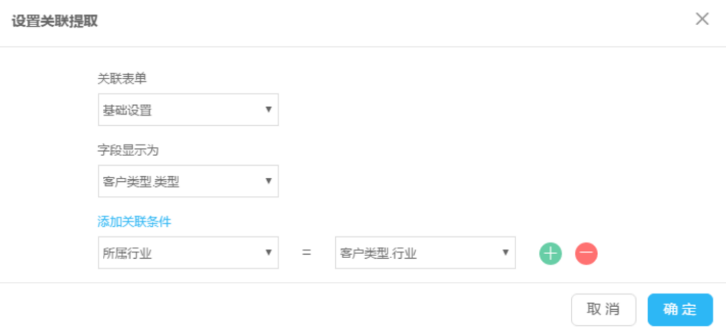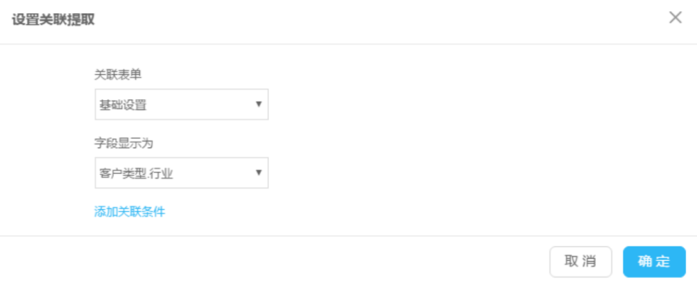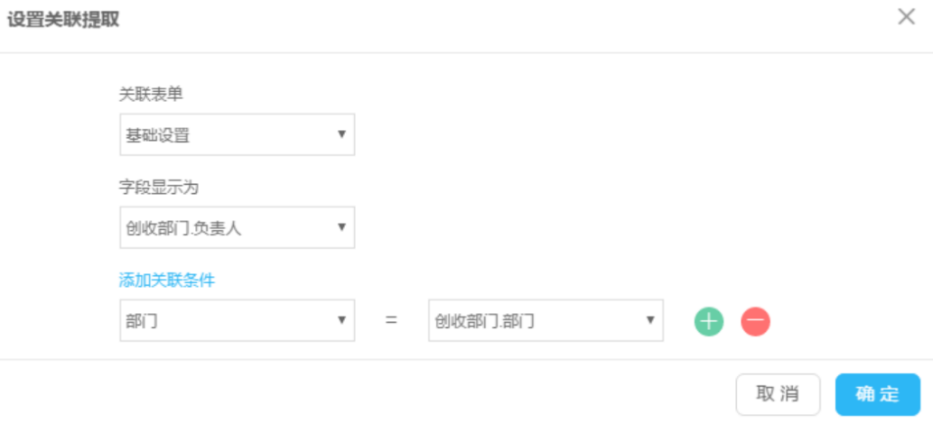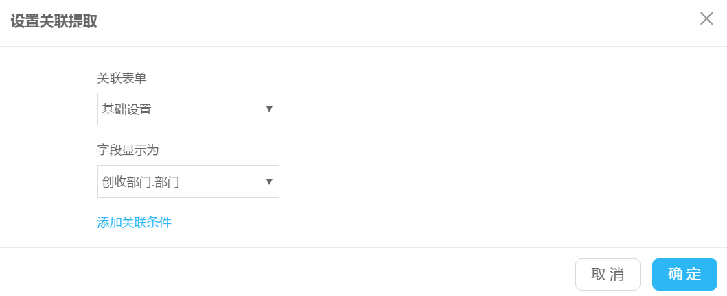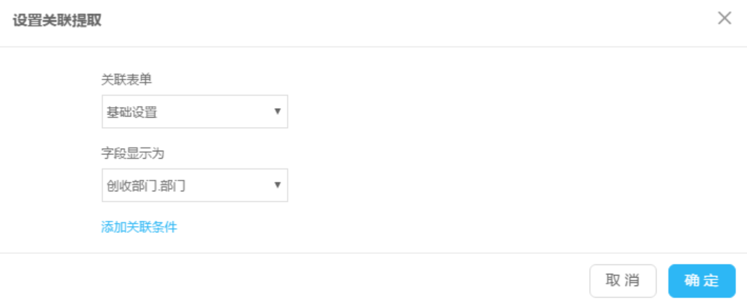 其中,部门为下拉选择、起始时间和结束时间为日期文本,分析结果为列表,分析结果包含应收款周期单行文本、应收金额货币文本两个子字段,部门选项值类型为关联提取,设置关联字段如下图: