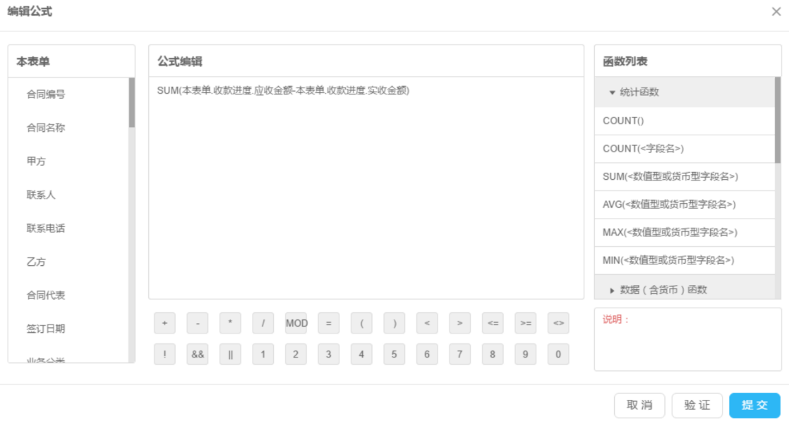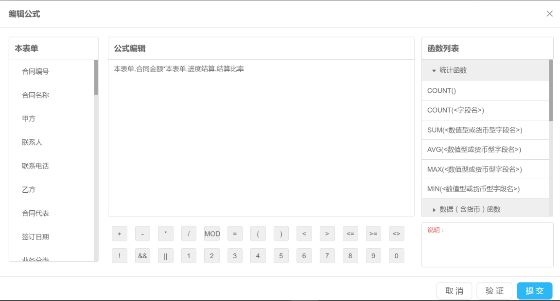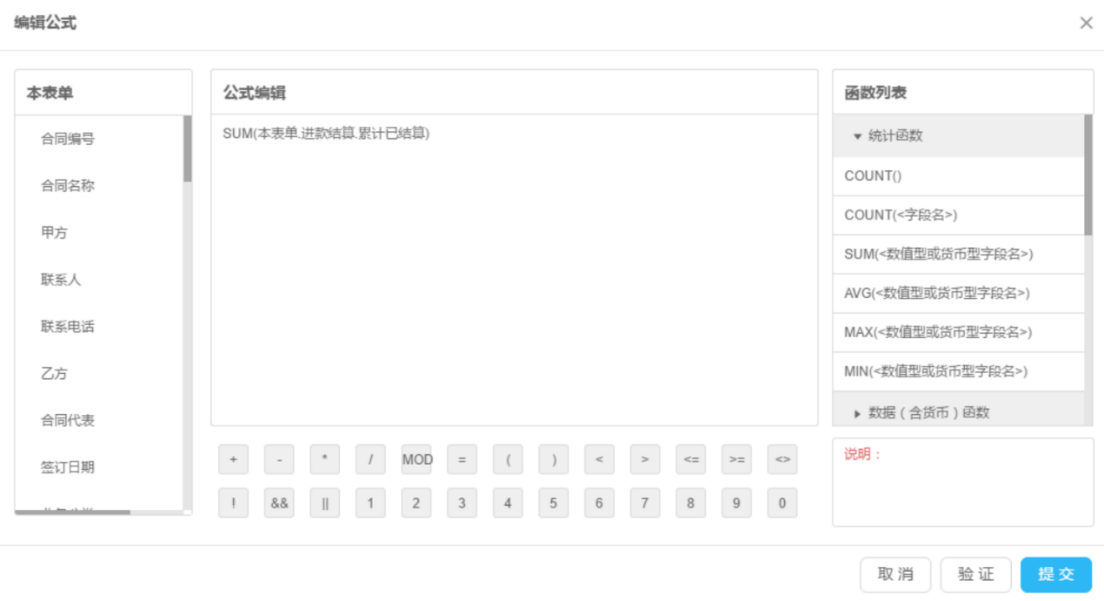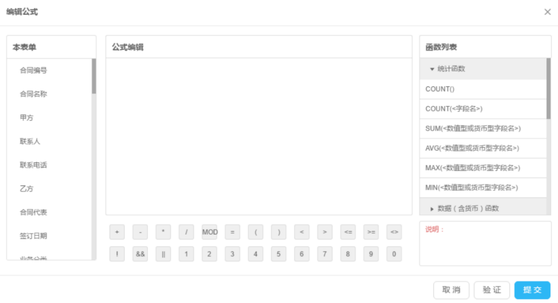 合同总金额货币文本的默认值类型设置为 表达式,表达式设置为: