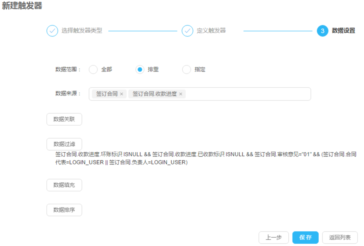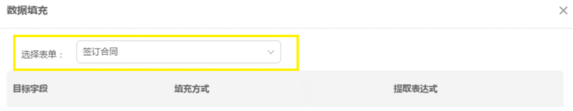 仅提取合同 提取 所有步骤(默认值) 新建触发 条件触发 数据范围:排重 数据来源:无 筛选条件:无 数据填充:选择表单:合同汇总.合同,目标字段填充定义如下: