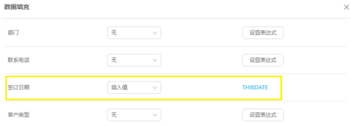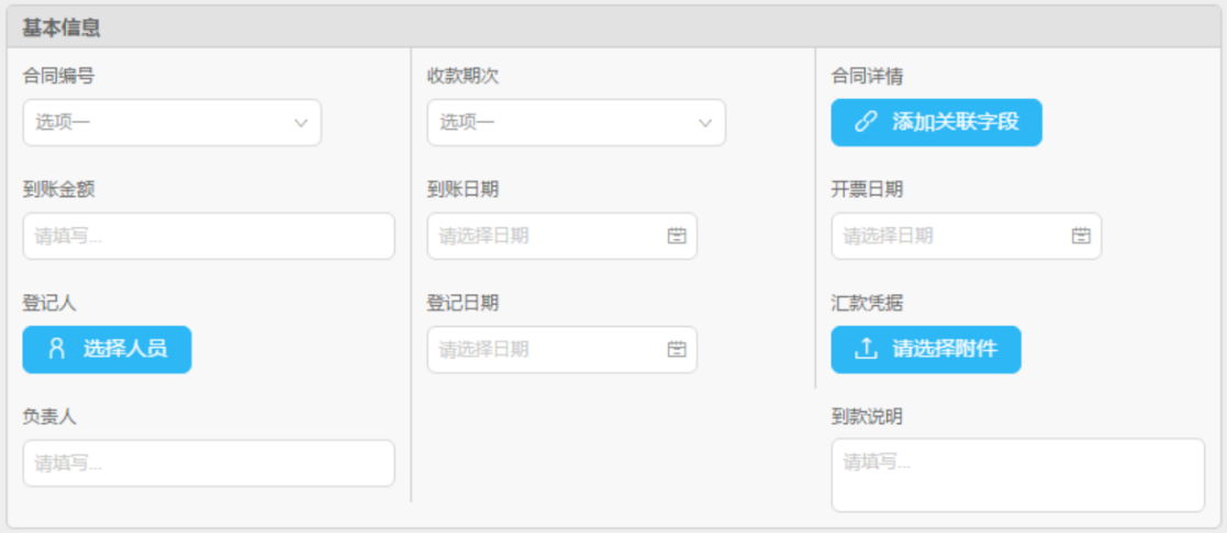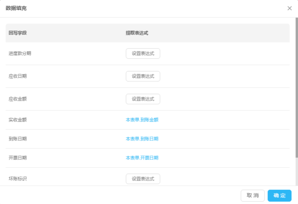 回写到款日期 回填 财务确定 保存触发 回填目标:签订合同.收款进度 查找条件:合同收款.合同编号=签订合同.合同编号;合同收款.收款期次=签订合同.收款进度.进度款分期 回写条件:本表单.到账=“已到账” 更新方式:实到金额的更新表达式为 本表单.到账金额;到账日期的更新表达式为 本表单.到账日期;开票日期的更新表达式为 本表单.开票日期