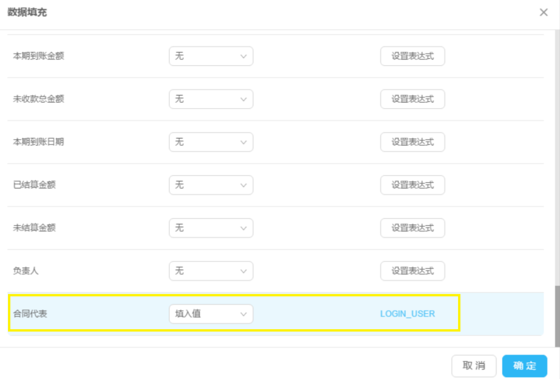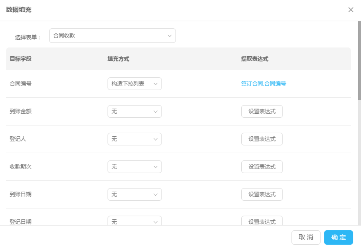 确认信息 提取 财务确定 修改触发 数据范围:全部(默认) 数据来源:无 数据关联:无 数据过滤:无 数据填充:选择表单为 合同收款;确任人的填充方式指定为 填入值,填充表达式为LOGIN_UID;确任时间的填充方式指定为 填入值,填充表达式为THISDATE 数据排序:无