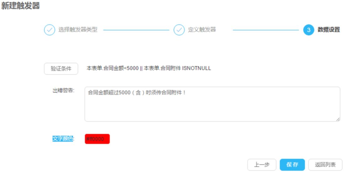 验证结算金额 验证 主管结算 条件触发 保存触发 验证条件:本表单.实际结算总金额=本表单.到账金额 出错警告:结算总金额应等于到账金额! 文本颜色:红色
