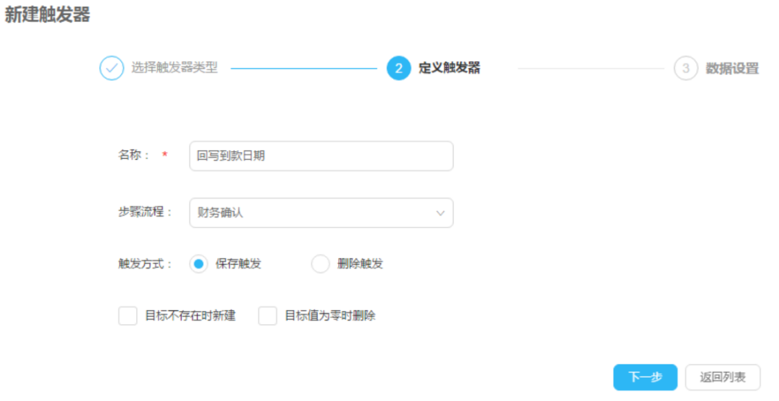 现以”回写到款日期”为列,描述”回填触发器”定义过程。点击 新建回填触发器,触发器名称定义为”回写到款日期”,流程步骤定义为 “财务确认”,触发方式定义为”保存触发”,取消勾选”目标不存在时新建”以及”目标值为零时删除”选项,如下图: