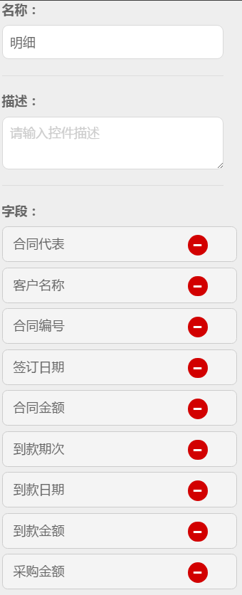 汇总结果部分包含一个 明细 列表,明细列表包含合同代表文本控件、客户名称文本控件、合同编号文本控件,签订日期文本控件、合同金额货币文本、到款期次文本控件、到款日期文本控件、到款金额货币文本控件、采购金额货币文本控件,列表设置为只读,如下图: