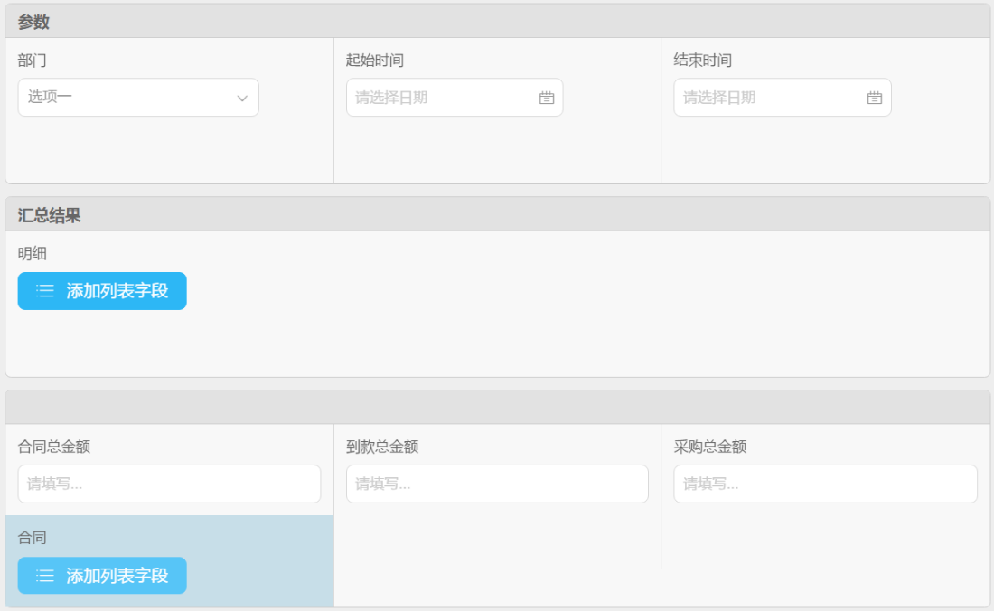 合同汇总表单由参数和汇总结果两部分组成。参数部分包括部门、起始时间和结束时间,部门采用下拉选择控件,起始时间和结束时间用日期控件,绘制结果如下图: