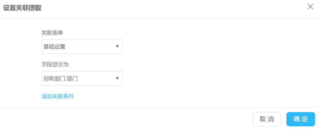 部门下拉选择控件的选项值类型定义为 关联提取,设置关联字段如下图: