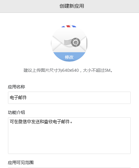 第2步:点击创建好的【电子邮件】应用,在“可信域名”处按照格式填写域名。并在 “可见范围”中选择该应用的使用范围。
