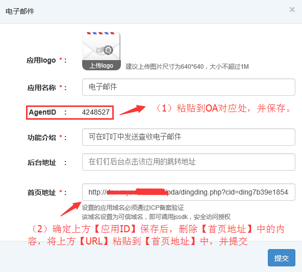第2步:点击【微应用】下新增应用【电子邮件】的“设置”按钮,在电子邮件设置界面中,将获取到的【AgentID】粘贴到上方(即OA系统->【企业微信设置】->【基础参数设置】界面)的【应用ID】内,并点击【确定】按钮。在上方【应该ID】保存成功后,把【首页地址】中的 https://www.tongda2000.com 删除,将复制到OA系统->【企业微信设置】->【钉钉应用设置】->【电子邮件】界面的URL复制到【首页地址】中。