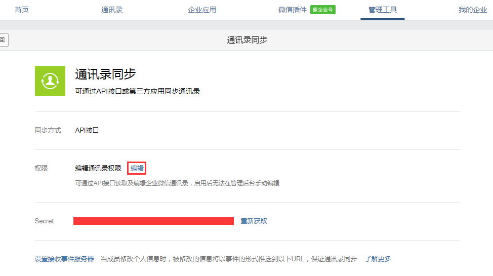 第4步:企业微信后台,在【管理工具】界面,点开【通讯录同步】,编辑权限设置为“编辑通讯录权限”保存,然后将Secret复制到OA系统->【企业微信设置】->【基础参数设置】的对应处,保存后点击界面中显示的“测试连接”按钮,提示“连接成功”。