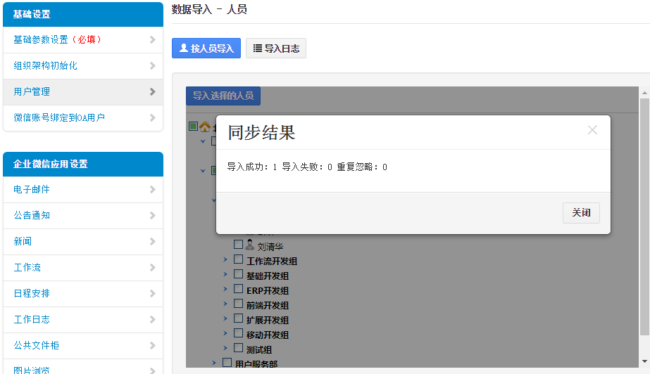 第5步:连接成功后,点击左侧菜单的【组织架构初始化】中的【OA组织架构同步到企业微讯】按钮。同步成功后,OA中的组织机构及成员会同时同步到企业微信平台的【通讯录】中。