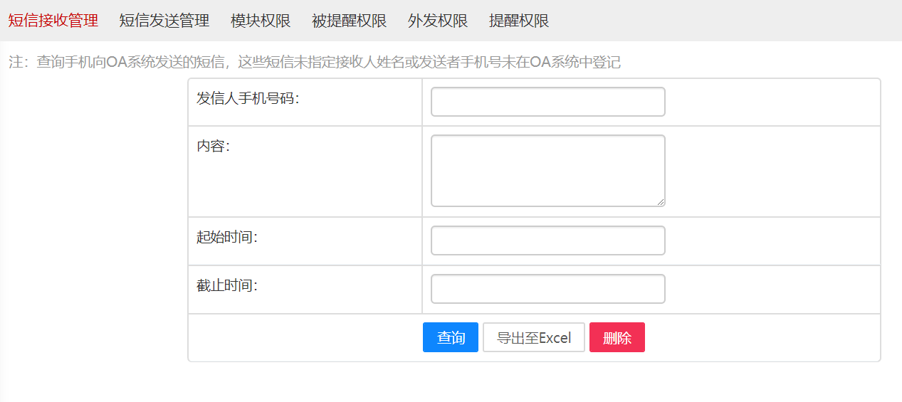 1. 短信接收管理,主要是查询和管理已接收的所有手机短信,对于查询所得的手机短信,导出至Excel对查询到的信息可以单条删除和批量删除。