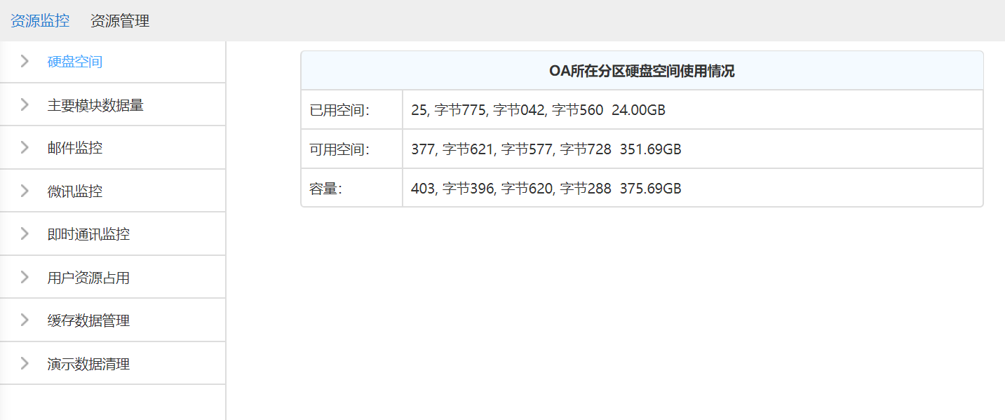 该模块可分为资源监控和资源管理两大功能。资源监控中可以查询服务器的硬盘使用情况、主要模块数据量、邮件和微讯的全部数据、即时通讯监控、用户资源占用和缓存数据管理。