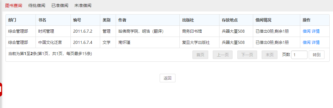 图书查询包含“图书查询”、“待批借阅”、“已准借阅”和“未准借阅”四个功能。后三个功能是图书管理员可以对借阅的申请进行分类查看。
