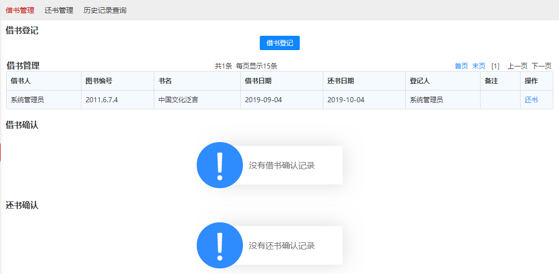借书和还书的登记是由专门的“借还书管理人员”进行的,在借书管理和还书管理中,进行借书登记和还书登记。在“还书管理”中,主要记录已还书本的记录,并且可将记录从还书管理中删除并加入到历史记录中。