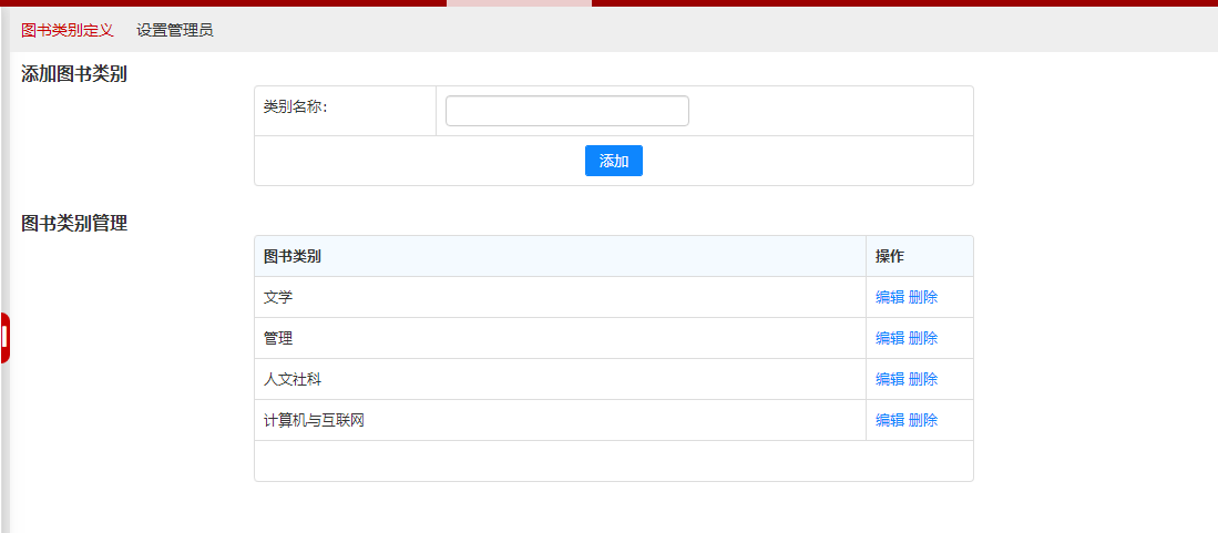 图书类别定义中对图书类别进行新增、编辑、删除操作。