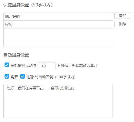 可以设置多组自动回复语句,方便在发消息时快捷回复;自动回复可以根据时间及在线状态设置回复短语,用于告知联系人;
