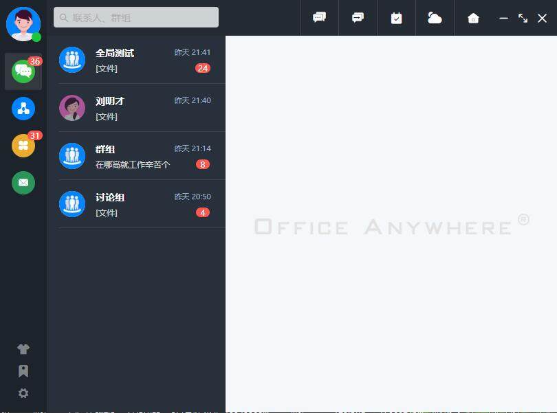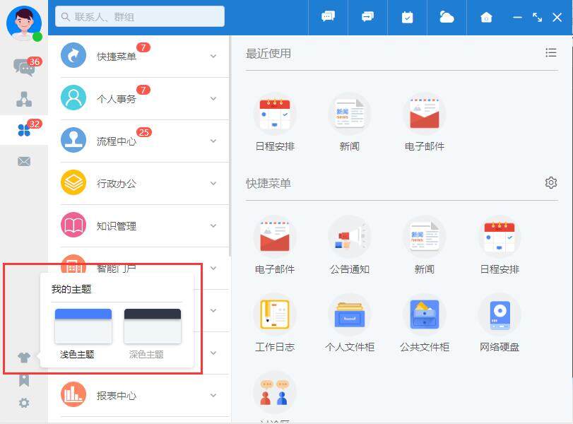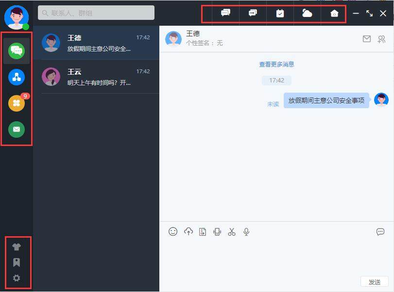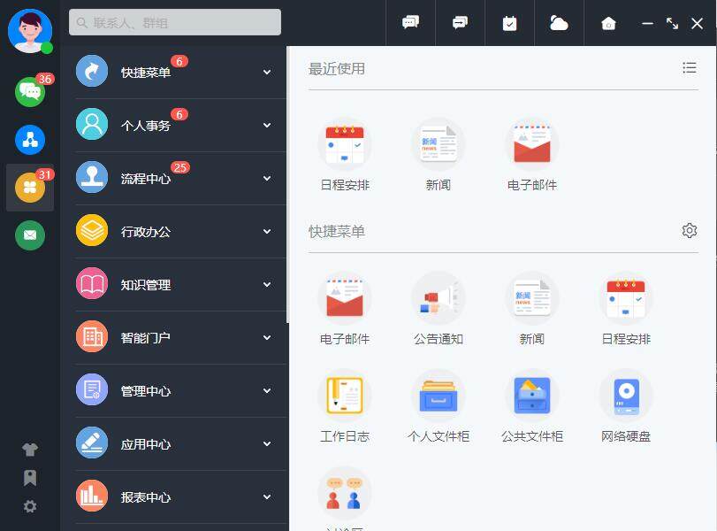 客户端左侧导航包含消息、组织、菜单、电子邮件四个常用功能,点击相应图标即可切换右侧显示区的展示内容;
