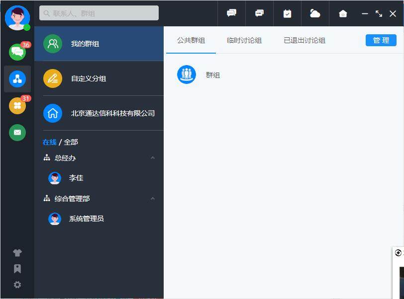在左侧主导航点击【组织】图标可显示组织机构,组织机构包含我的群组、自定义分组、以及公司组织机构;