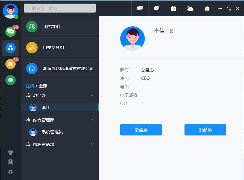 组织机构根据部门层级进行显示,可显示全部用户也可以只显示在线用户 ,点击用户右侧会显示该用户的基本信息,可对用户发消息、发邮件;