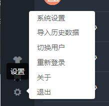 设置中包含系统设置、导入历史数据、切换用户、重新登录、关于客户端、退出客户端等操作;