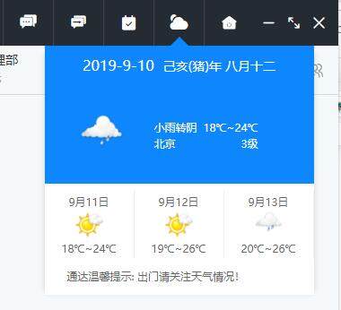 点击天气会弹出天气提示框,展示最近四天的天气情况,方便及时掌握天气情况;