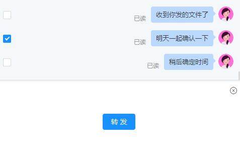 聊天消息,支持转发功能。针对重要的,需要共享的消息,可以在聊天界面中右击消息,选择转发,可同时选择多条消息,转发给最近联系人、群组、组织机构三个分类下的多个联系人。