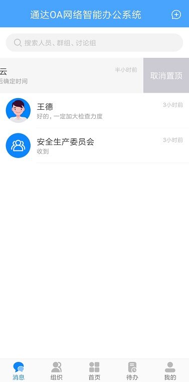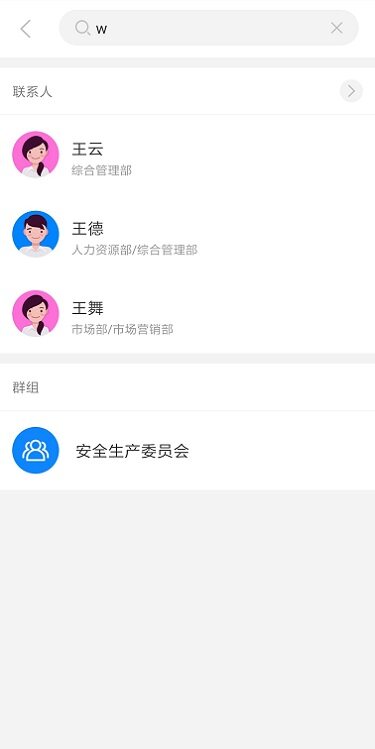 消息列表顶部的搜索栏可以搜索最近联系人中的人员、群组、讨论组,点击搜索结果可以直接跳转至消息收发界面;