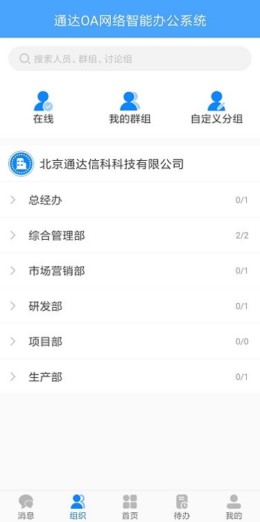 点击底部导航的组织可切换至组织页面,包含了在线、我的群组、自定义分组、组织架构,顶部搜索栏支持搜索人员、群组、讨论组、部门;