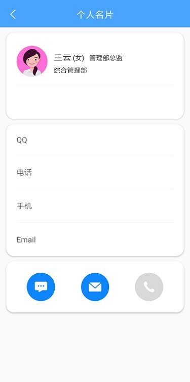 点击人员会展示当前用户的个人名片,可执行发消息、发邮件,若个人名片中有手机号码还可直接调用手机电话功能拨打电话;