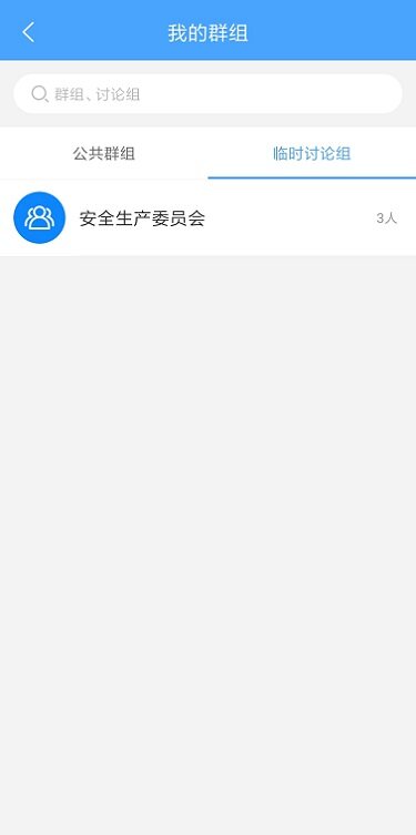 点击我的群组,可查看公共群组、临时讨论组,点击页签下的讨论组可直接打开消息界面;