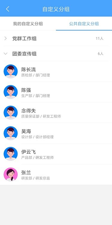 点击自定义分组,可查看我的自定义分组和公共自定义分组,点击分组名称列可展开/收起分组内人员显示,展开分组时可查看分组内所有人员,点击人员头像可打开消息界面;