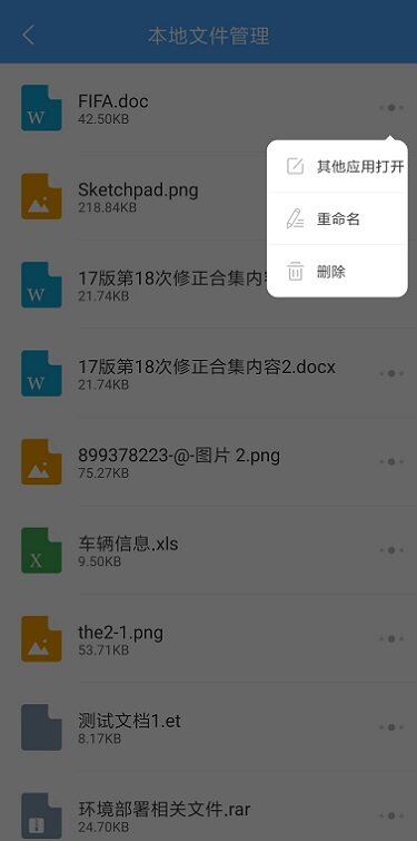 本地文件管理可以对消息中接收到的文件,业务模块附件中的文件进行重命名及删除操作,也可以使用手机中其他APP打开这些文件进行查阅;
